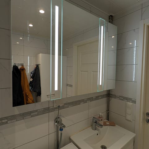 Myydään muuton tieltä vessan peilikaappi. Ilmeisesti massiivipuuta, jämäkkää tekoa. Sisältää kaksi hyllyä, joiden paikkaa voi säätää helposti tappien avulla. Kaappiin mahtuu yllättävän paljon tavaraa sen kokoon nähden!
