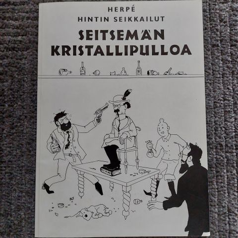 Seitsemän Kristallipulloa sarjakuvakirja, pehmeillä kansilla. Kannessa kapteenin pullon päällä tahra, etulehdellä omistuskirjoitus, muuten kunnossa.