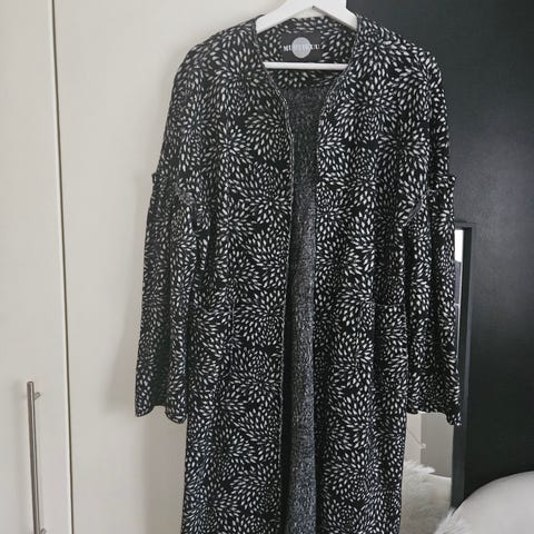 More & More pitkä takki naisten koko 38, valmistettu villasta. Takissa on kirjava kuviointi ja se on suunniteltu naisten käyttöön.