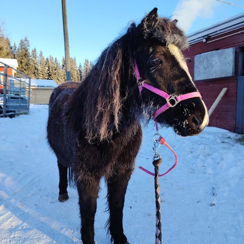 Poni on todella kiltti, enemmän varovaisen oloinen, kuin päälle päsmäri. Toki olemme tutustuneet vain hetken. Kaviot oli melko pitkät tullessaan ja ne on nyt kerran vuoltu, kaipaavat jatkossa säännöllistä huoltoa. Kavioissa ei kengittäjän mukaan merkkejä kuumeesta. Poni vaikuttaa hyvinvoivalta muuten ja liikkuu mielellään, aika kivastikin. Korkeutta ei ole suuresti, mutta vankka Poni.