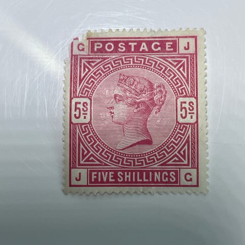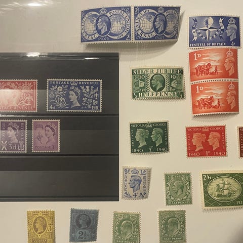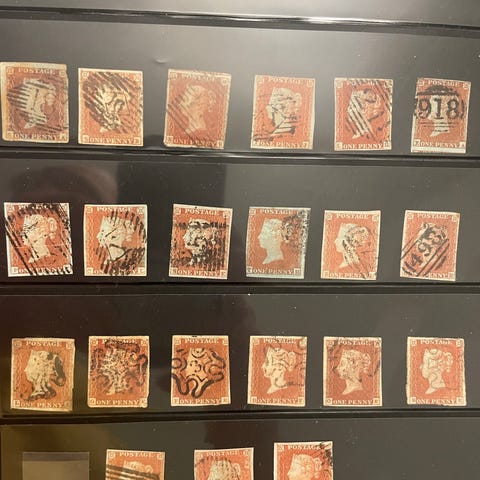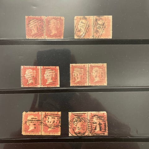 Britannian postimerkkikokoelma, jossa on useita vanhoja punaisia postimerkkejä. Merkeissä näkyy erilaisia leimoja mm. Lontoo