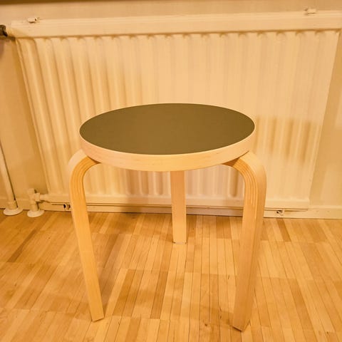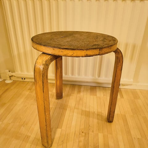Artek Alvar Aalto jakkara 60. Puuosat kellastuneet, pinnassa pientä naarmua ja yksittäinen vähän syvempi jälki (ks viimeinen kuva), reunoissa käytön jälkeä/koloja. Jaloissa pientä kolhua. Yleisilme kuitenkin siisti. Jalat tukevasti kiinni. Nouto Oulun Hiukkavaarasta tai postitus toridiilinä jalat purettuna.