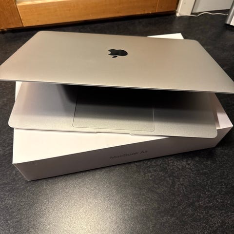 Apple MacBook Air kannettava tietokone hopeanvärinen. Laite on varustettu näppäimistöllä ja kosketuslevyllä. Mukana tulee virtalähde ja latausjohto. Kannettavassa on yhdessä kulmassa pieni dingi, joka ei vaikuta toimintaan mitenkään.