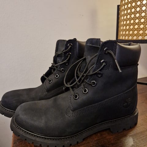 Timberlandin mustat vedenpitävät nilkkurit aitoa nahkaa. Koko US 9.5 W (w=leveämpi lesti) vastaa EU-kokoa 40.5–41. Malli on Timberlandin naisten mallistosta mutta istuu käytännössä hyvin myös miesten jalkaan.