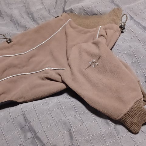 Harmaa Hurtta-merkin puku, jossa etutassuille lahkeet, heijastimet ja selässä reikä valjaiden lenksua varten, kankaan nukkaantumista siinä kohdin, muuten hyväkuntoinen