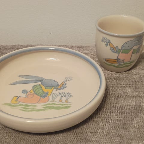 Myydään pois itselle tarpeeton sympaattinen Pentikin pupulautanen ja -kuppi.