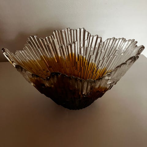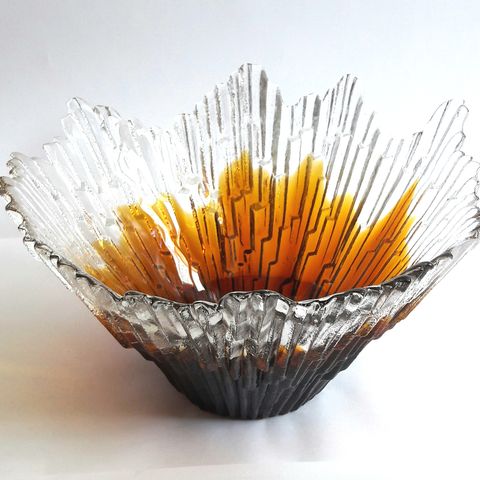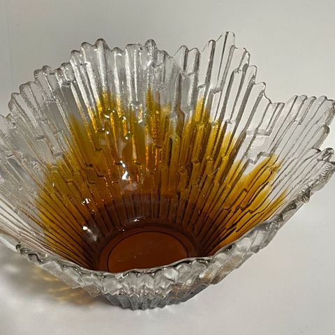 Myydään näyttävä Humppilan lasitehtaan valmistama Revontulet-sarjan kulho. Suunnittelija Tauno Wirkkala. Kulhossa on sarjalle ominainen upea struktuuri ja kaunis väritys, joka liukuu meripihkan ruskeasta kirkkaaseen lasiin.