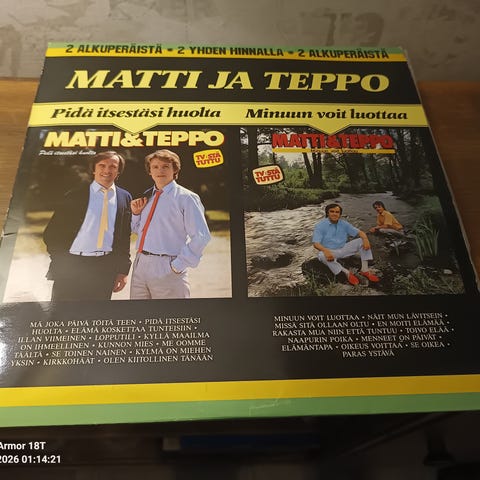Levyt näyttää siltä että onkohan edes koskaan soitettu, levy 1 b puoli jotain pientä tahraa mutta en uskalla hangata poiskaan 😅 kansissa aivan pieni jälki takakannen alaosassa ja selkämyksessä mikä näkyy kuvissakin, muuten tämä olisi ns. mintti koko setti, eikä se kaukana ole nytkään
