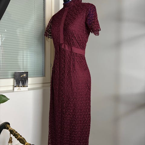 Käytettynä ostettu tummanpunainen mekko. Itselle hieman liian pieni. Niskamerkki leikattu pois, ei tietoa merkistä