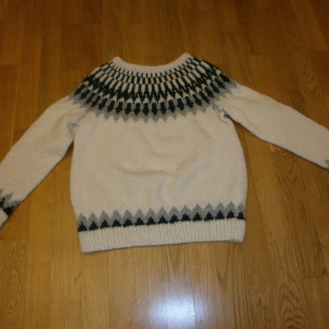 Uniikki käsin tehty villapaita, kaunis kirjoneulekuvio pääntiellä.