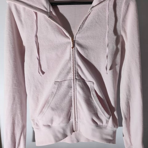 Juicy Couture tyylinen huppari vetoketjulla. Mielestäni materiaali on veluuria. Koko M, mutta vastaa enemmän kokoa S. Olen käyttänyt itse 32 kokoisena, joten sopii monelle vartalolle. En tunnista tuotemerkkiä. Pesulappu on haalistunut täysin joka kertoo, että tuotteella on ikää. Siitä huolimatta kestävä ja hyvässä kunnossa.