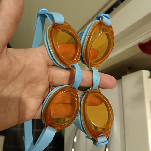 Keltalinssiset Speedo-uimalasit, jotka jääneet käyttämättä, ja ovat säilyneet lähes uudenveroisessa kunnossa.