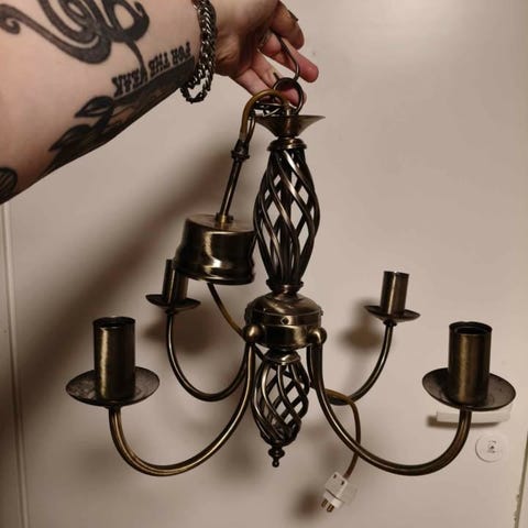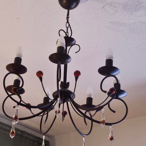 Hieno valko-kulta marmorikuvioinen kattovalaisin. 5 haarainen. Halkaisija n 50cm, ja säädettävissä oleva korkeus pisimmillään n 90cm. Hehkulamput eivät kuulu hintaan.