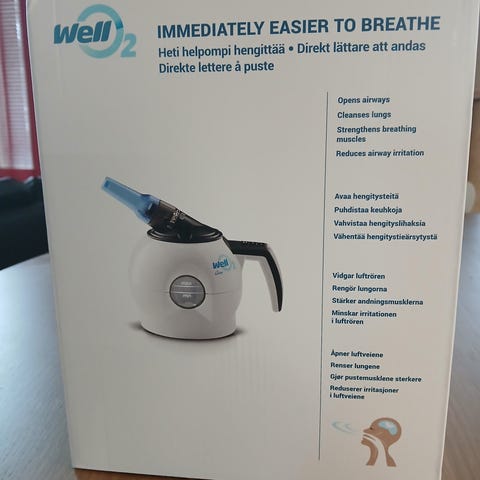 Vähäiselle käytölle jäänyt WellO2 hengitysharjoituslaite. Mukaan tulee kaikki alkuperäiset osat. Löytyy myös vajaa levyllinen laitteeseen laitettavia mentolitabletteja.