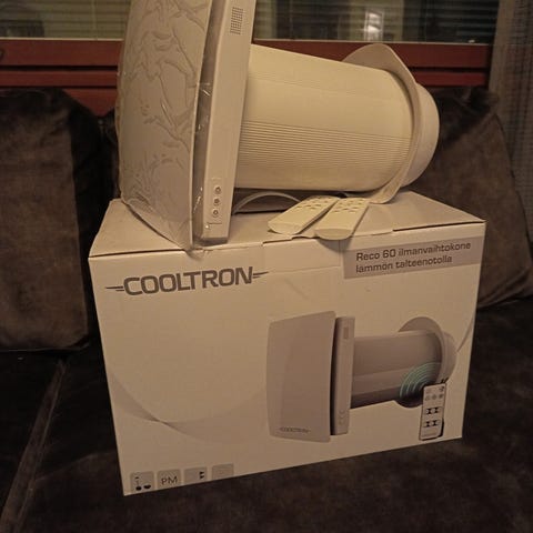 Cooltron Reco 60 ilmanvaihtokone lämmön talteenotolla. Laite on suunniteltu ilmanvaihdon parantamiseen ja energian säästämiseen lämmön talteenoton avulla. Sopii asuin- ja pieniin toimitiloihin. Koneita 2 kpl:tta. Hinta 200eur/kpl. Uuden koneen hinta n.340euroa/kpl.