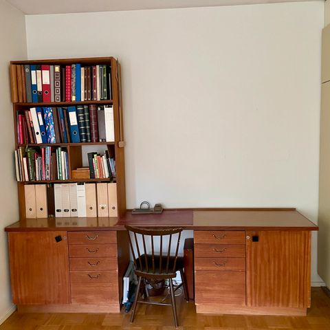 Työpöytä, jossa on viisi vetolaatikkoa ja avohylly. Pöydän molemmilla puolilla on ulosvedettävät lisätasot.