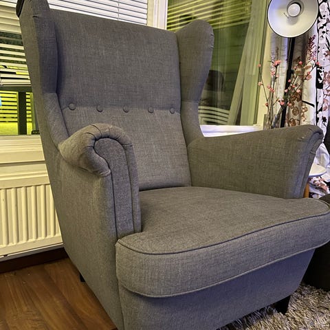 Hakusanat: nojatuoli, korkea selkänoja, nojatuolit, pyöristetyt käsinojat, lepotuoli, ikea, ikean, taso, levy, ruotsi, harmaa, huonekalu, huonekalut, design huonekalut, klassinen, Tuoli, Valmistaja, design, napitettu, tuolit, käytetyt huonekalut