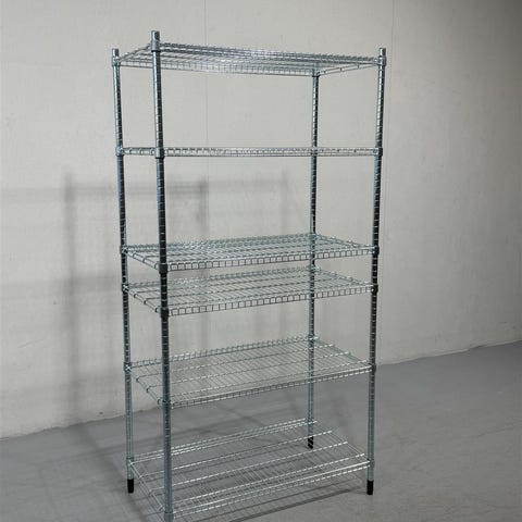 Hyllykkö, jossa on viisi tasoa ja mustat kehykset. Hyllyjen pinta on vaalean puun sävyinen.