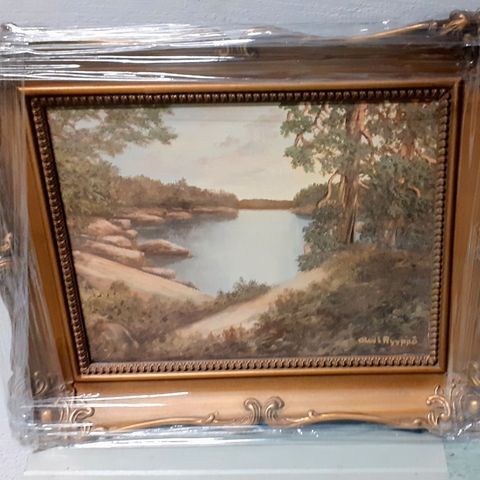 Olavi Ryypön öljyvärityö "Purjevene myrskyssä". Työn korkeus on 48 cm ja leveys 74 cm. Kehys 58 X 83 cm.