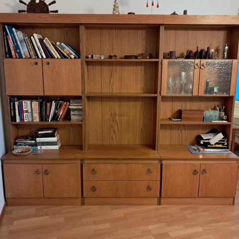 Hyväkuntoinen kirjahylly. Mahdollisuus ottaa esim vain yksikin osa. Mitat yhden osan mukaa. Lasivitriiniin saa valon halutessaan.
