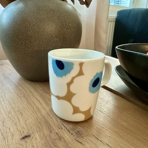 Myydään Marimekon unikko-muki. Tilavuus 2,5 dl. Unikot ovat sinisiä ja sisus ja varsi vihreät. Käyttämätön, tarrat kiinni. Tehty Aasian markkinoille.