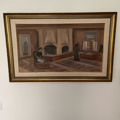 Professori Eero Uroman öljyvärityö "Kurjet saapuvat". Työn korkeus on 72 cm ja leveys 49 cm. Kehys 93 X 69 cm.