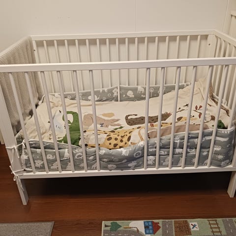 Pinnasänky, jonka pohjaa voidaan säätää eri korkeuteen vauvan kasvaessa, sekä toinen laita vaihdettavissa kun lapsi osaa itse poistua sängystä. Meidän lapsella mennyt sama sänky 4 ikävuoteen saakka. Patjan saa halutessaan mukaan (täysin puhdas ja hyväkuntoinen). Sängyn ulkomitat 125x65, patjan koko 120x60. Pieniä hiertymiä saanut yksi jalka (kuva).