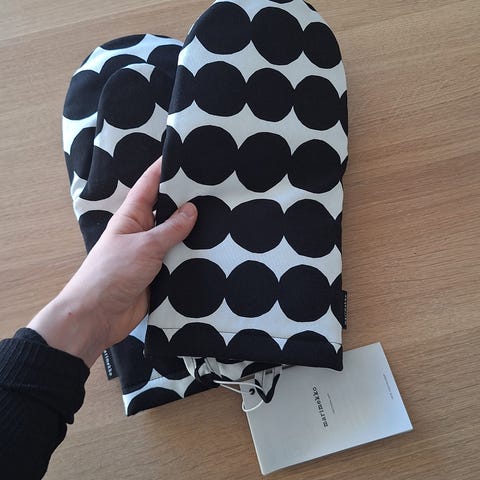 Marimekko Räsymatto 3 osainen keittiötekstiilisetti, essu ja kaksi uunikinnasta. Tekstiilit on valmistettu puuvillasta. Uunikintaissa on toppaukset ja lenkit ripustamista varten. Essussa on nepparilla säädettävä kaulanauha ja etutasku. Setti on pakattu Marimekko-logolla varustettuun laatikkoon. Uusi, käyttämätön, vaikka lahjaksi!