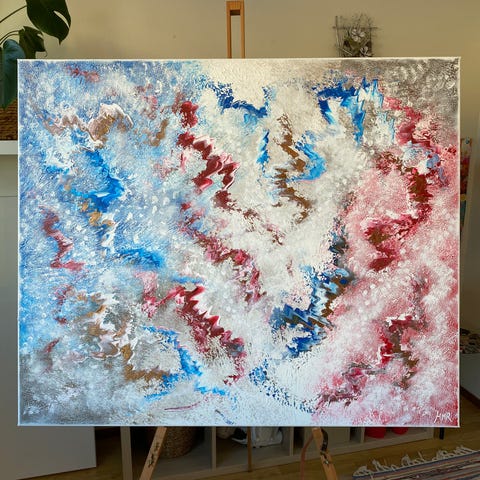 Koko 120 x 100 x 4cm. Maalattu kanvakselle akryylimaaleilla. Laadukas teos, ripustusvalmis ja signeerattu. Takana perinteinen rautalanka kiinnike, helppo ripustaa. Teoksessa on paljon yksityiskohtia ja teos on voimakas ja silti rauhallinen. Käytetty korkealaatuisia materiaaleja. Teos on vielä paremman näköinen livenä. Kaunis massiivinen 4cm syvä kanvas on arvokkaan näköinen. Teen myös tilaustöitä. Tilaustöiden hinnat menee koon mukaan ja ovat yleensä + 20-40e lisää täällä listattuihin hintoihin verrattuna, eri tyyleillä hieman eri hinta. Kysy lisää. Lisää erilaisia teoksiani myynnissä täällä ja esillä myös instagramissa tilillä heidiabstractart. Kannattaa ottaa insta tili seurantaan, uusia teoksia valmistuu jatkuvasti. Postitus sopii myös matkahuollon taulukuljetuksena (35,90e). Lisäkuvia/videota saa pyytämällä tai poikkea katsomaan. Myynnissä myös muualla.