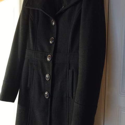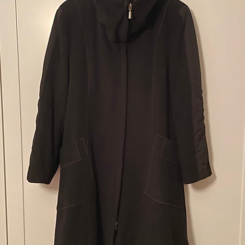 Musta. A-linjainen villakangas takki. Koko 48. Kai-kai 55cm. Halkio takana. Kuin uusi. Kerran käytetty
