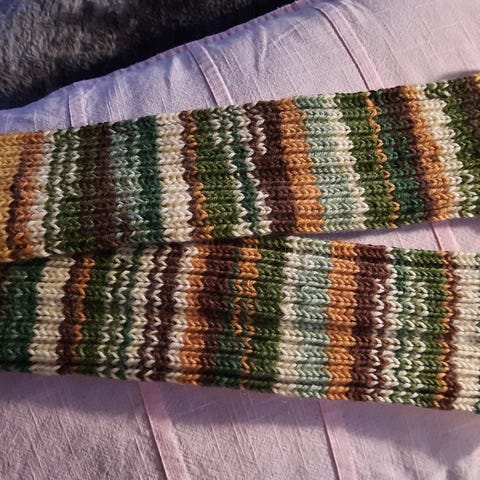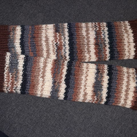 Käsinneulotut ruskeasävyiset säärystimet.
