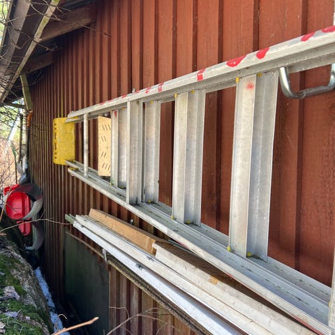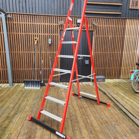 Kuvassa on erilaisia tikkaat ja jakkarat. Tikkaat ovat metallirakenteisia ja jakkarat ovat pienikokoisia, sopivia tukeviksi alustoiksi erilaisiin työtehtäviin.