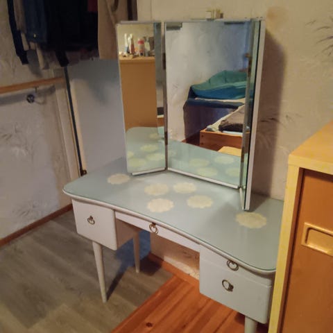 Kaunis ja siro kampauspöytä tai peilipöytä, mutta harmikseni ei mahdu enää kotiin.