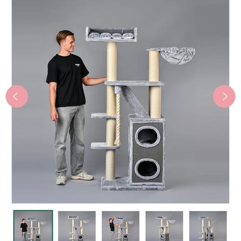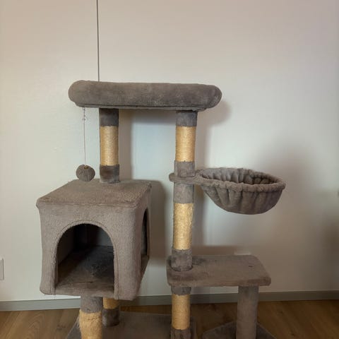 Vähäisellä käytöllä ollut pieni raapimispuu ja maja. Muuten hyvässä kunnossa, mutta majan nurkasta nirhasi kani pienen palan kangasta. Pohjan mitat 38,5 cm x 50 cm ja korkeus 43,5 cm.