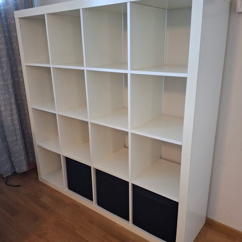 Ikean valkoinen Kallax 4x4. Neljässä lokerossa ovi.