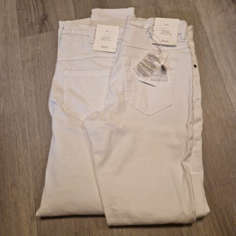 Valkoiset Zizzi farkut 50/L82. Ostettu sellpystä käytettynä, ei tullut omaan käyttöön. Viimeisessä kuvassa näkyy nukkaa haaroissa.