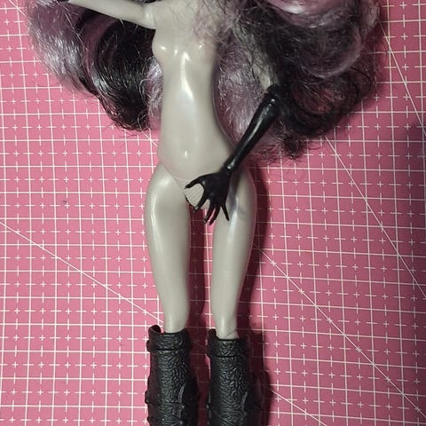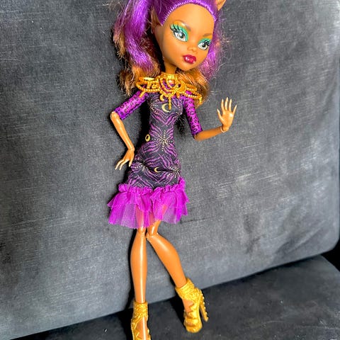 Kuvan nukke ja kissa.laukku ja kultakoru puuttuu. Hyväkuntoinen.ei kuminauhaa .kengissä soljissa sävyero.