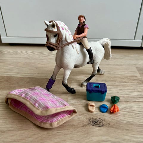 Schleich hevonen ja ratsastaja. Mukana tulee riimu ja loimi.