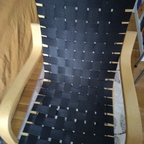 Artek-tyylinen, kevyt ja nätti satulavyötuoli (nojatuoli).