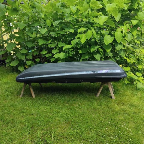 Thule kattoboksi 170cm pitkä. Ollut useamman vuoden käyttämättä ja kuvissa pölyinen.