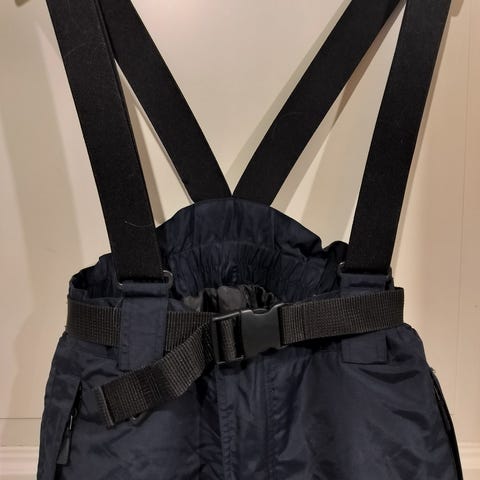 Mustat, naisten housut lasketteluun tai ulkoiluun. Henkselit eivät irrotettavissa. Säädettävä vyötärö. Kaksi taskua sivuilla. Muuten siistit, mutta henkselin kuminauha takaa hieman hapristunut. Lämpöiset housut.