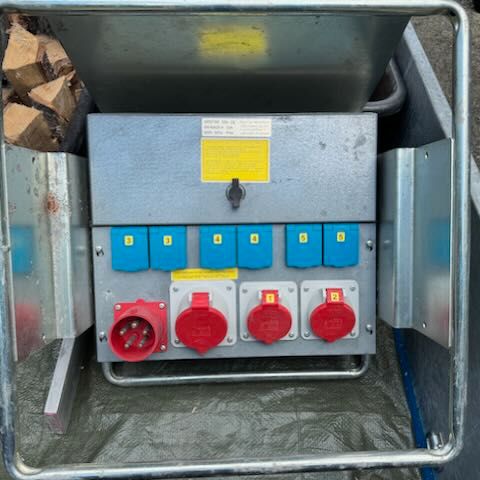 Sähköjakorasia, jossa on kolme 3-vaihe 16A punaista pistoketta ja neljä 230V sinistä pistoketta. Metallirunkoinen laite, joka on suunniteltu jakamaan sähköä useille laitteille samanaikaisesti.