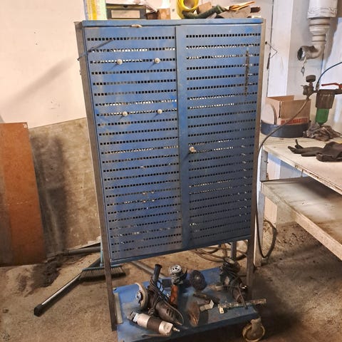 Metallinen työkalukaappi sinisessä värissä, jossa on kaksi ovea ja useita säilytyslaatikoita. Soveltuu työkalujen ja pienten osien järjestämiseen ja säilytykseen. Ollut käytössä autokorjaamolla. Kunto hyvä, mutta tarvitsee puhdistusta.