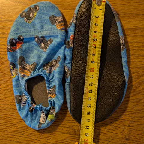 Paljon käytetyt Slipstop-tossut, koosta ei täyttä varmuutta, mutta noin 27-28. Ei enää mitkään siisteimmät tossut, mutta hyvin menisi vielä esim.päikyssä.