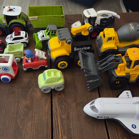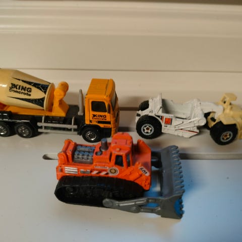 Pienet hyväkuntoiset kulkuneuvot. Työkoneet nulkevat itsekseen kun vetää ensin taaksepäin maata vasten. Kestävää muovia. Mukana traktori , kuorma-auto , betoniauto ja kaivuri .