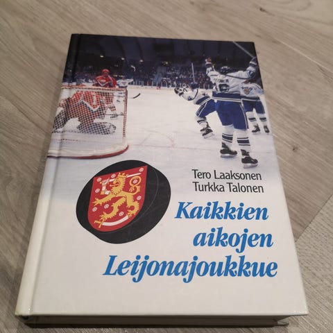Myydään uusi Jääkiekko-Leijonat kirja. Kirjassa on runsaasti valokuvia ja tekstiä, jotka käsittelevät jääkiekon historiaa ja Suomen maajoukkueen vaiheita.