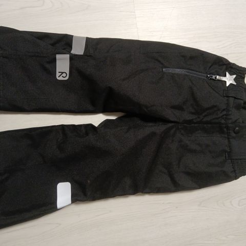 Reima lasten housut, koko 98. Väri musta. Housuissa on joustava kuminauhavyötärö ja lahkeissa kuminauharesorit. Moitteemassa kunnossa, lukuunottamatta muutamaa pientä tahraa edessä. Housuja ei ole pesty. Taloudessa ei ole lemmikkejä eikä käytetä hajusteita.
