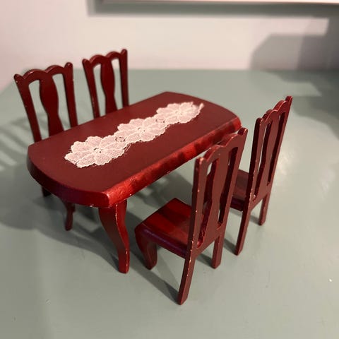 Ruokapöytä tuoleineen nukkekotiin, arviolta 70-luvun setti.