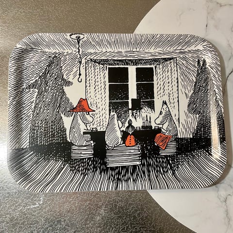 Tove Janssonin tarinaan pohjautuva kuva. Uusi tarjotin ohutta vaneria.
