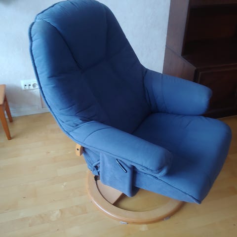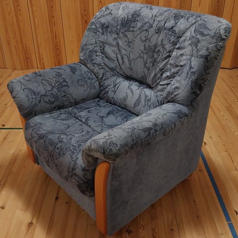 Tukevaa tekoa oleva kankainen nojatuoli, jossa on hyvä istua. Pinnat ovat siistit, käytönjäljet ovat vähäiset. Istuinkorkeus on 45cm.